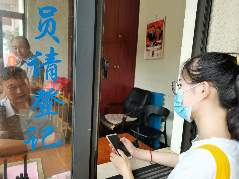 2020年8月10日,“指尖上的疫情”团队成员杨佳格对疫情期间负责检查进出人员体温健康码的小区保安进行采访。