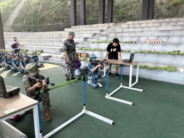 课后在训练场设置的激光模拟射击训练区成为热门打卡点。新生们轮流使用95式仿真激光枪进行打靶,枪身重量、后坐力均高度还原真实射击感受。一名体验学生兴奋地说:“后坐力震得肩膀发麻,和影视剧里一模一样!这次体验让我对军人职业多了份敬畏!”