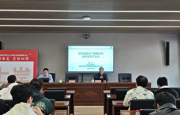 讲座中,钟兴系统介绍了低压电解水制备臭氧技术的原理、关键材料与系统设计,重点分享了其团队在高效、低能耗臭氧发生器研发方面的最新进展,并围绕该技术的产业化路径、市场前景与现实挑战进行了深入剖析。他结合自身在科研攻关与技术转化中的实践经验,与在场师生探讨了如何从实际需求中提炼科学问题、推进产学研协同创新的思路与方法。