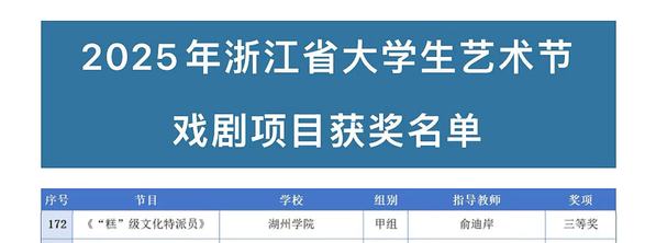 近日,由省教育厅、省文化广电和旅游厅、团省委、省财政厅、浙江广播电视集团联合主办的2025年浙江省大学生艺术节圆满落幕。经过层层选拔与激烈角逐,我校选送的作品脱颖而出,获甲组舞蹈类二等奖、戏剧类三等奖各1项。
